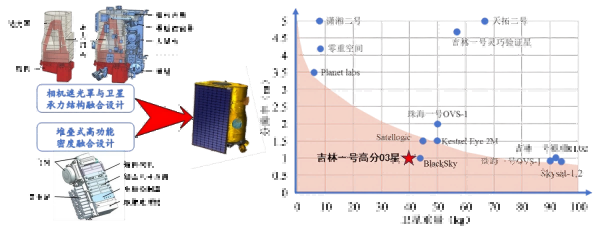 图1. 攻克了超轻量化亚米级光学卫星星载融合设计技术,设计了面向成像全链路优化的小口径亚米级光学系统,发明了小口径空间反射镜柔性支撑结构和轻型空间相机综合主支撑背板,设计了堆叠式高功能密度卫星电子学系统,提出了融合相机遮光功能的超轻量化卫星承力结构,建立了亚米级高集成卫星微振动抑制与温度精密控制模型。
