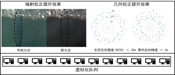 图3. 攻克了海量遥感数据星地联合高精度实时处理技术,建立了探测器温漂和像元响应非线性模型,提出了在轨逆向补偿校正方法,攻克了光学拼接卫星多元非线性辐射特性校正技术;提出了以多期参考影像为几何基准的内、外方位定标方法,分别建立了相机二维畸变误差多项式补偿模型和惯性系下在轨影像与参考影像相对姿态解算模型,采用多期在轨影像平差迭代方法修正模型参数。